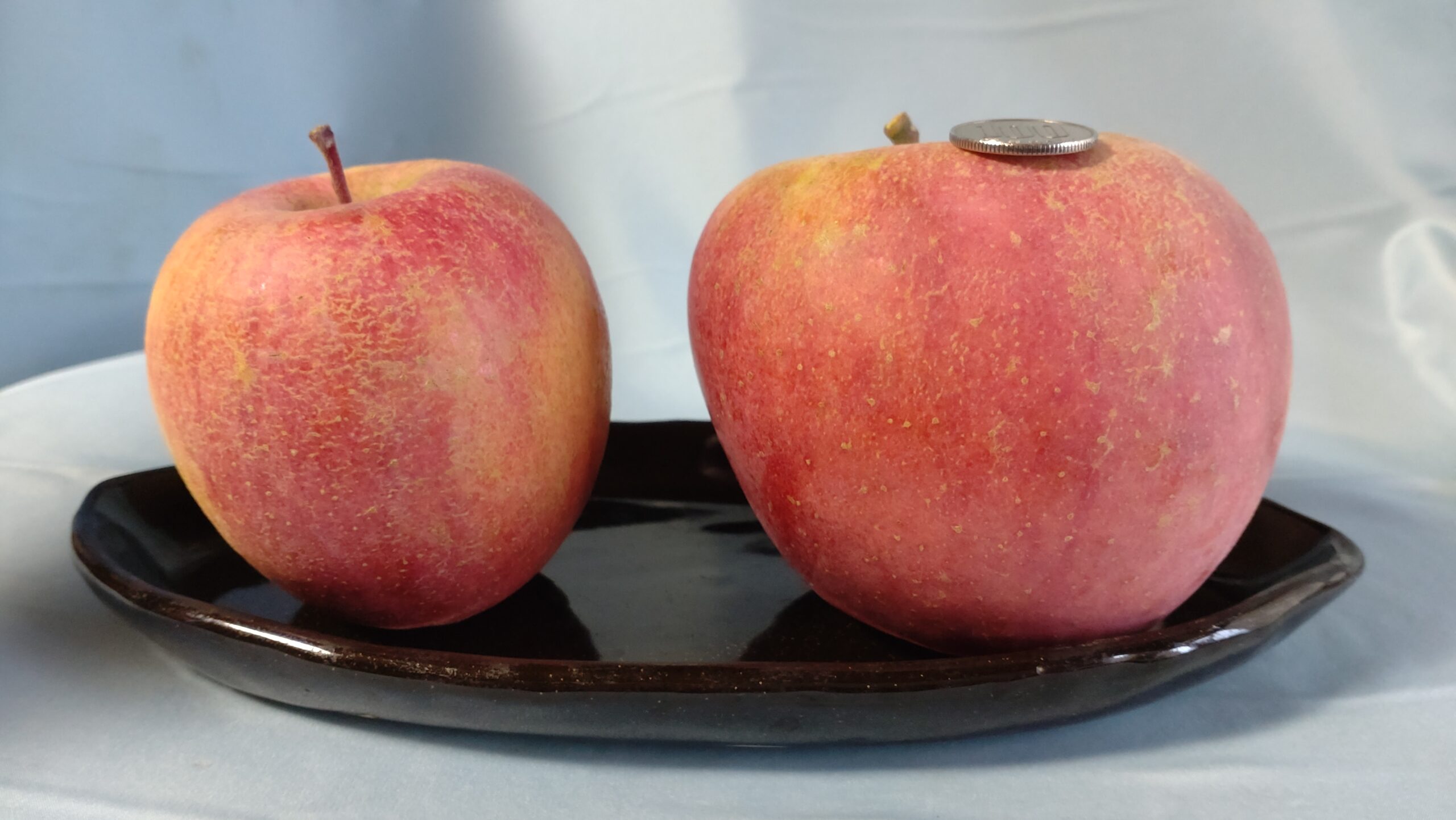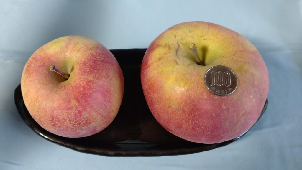 通常の この サンふじ のような赤いリンゴは 赤い色を濃くするために(日がよく当たるように)実の周辺の葉っぱを摘むんだそうです。