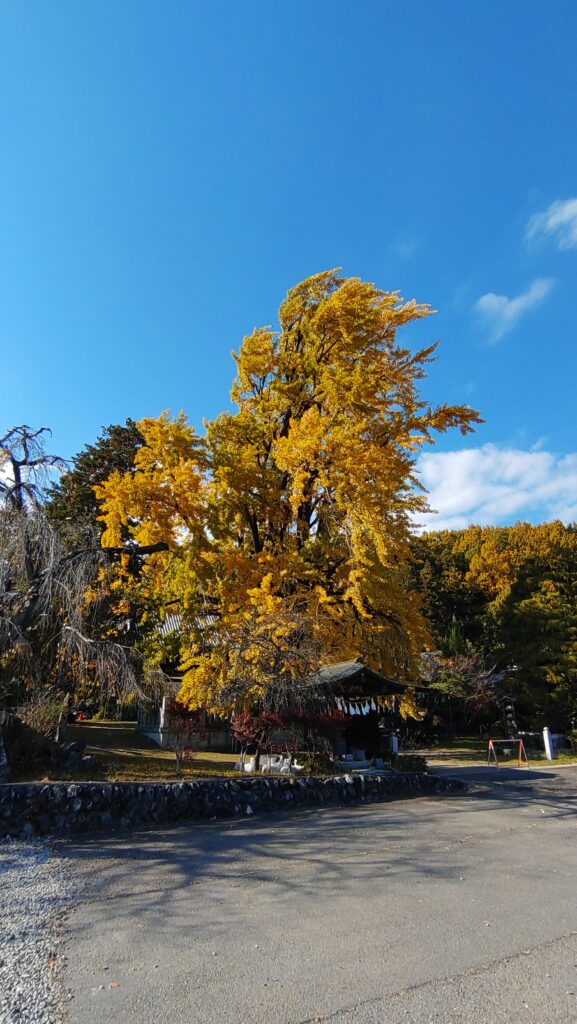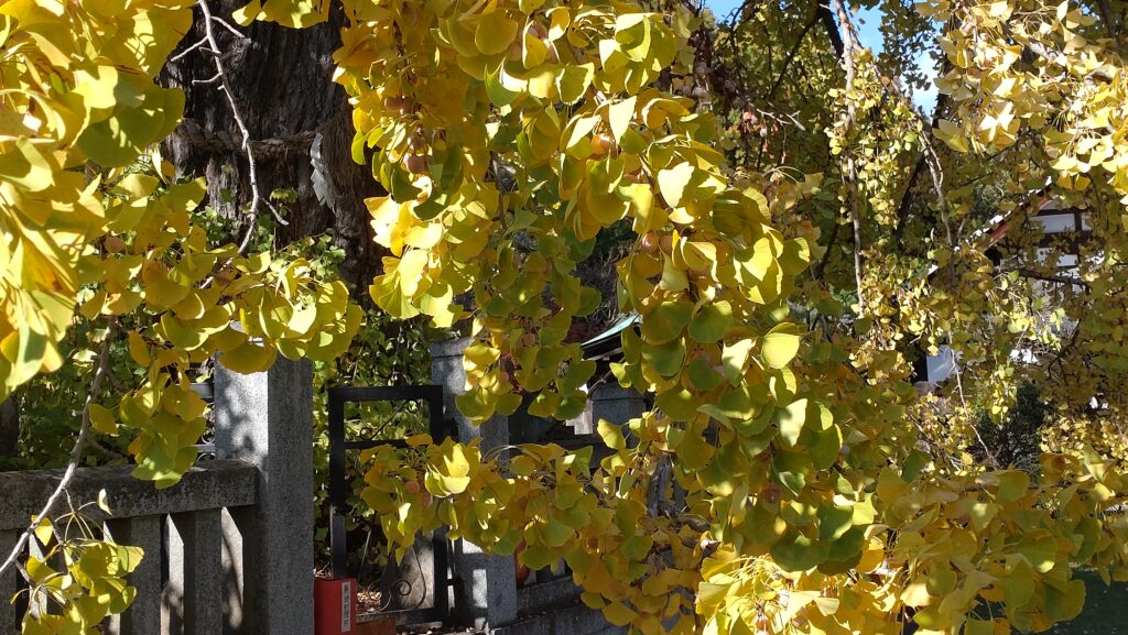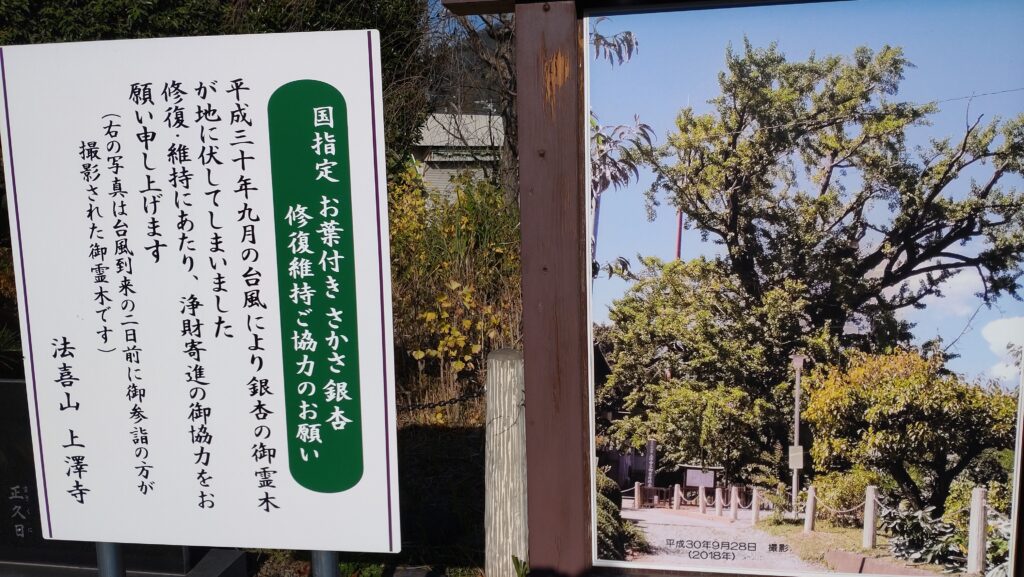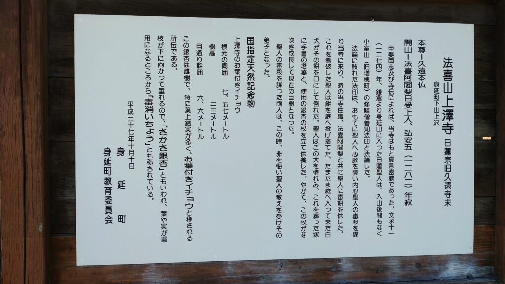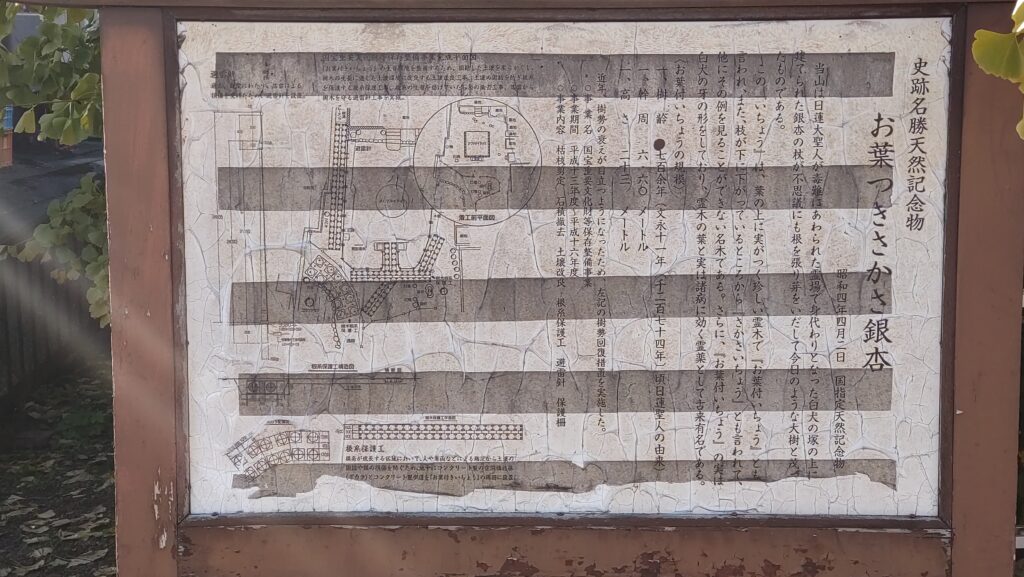 【この銀杏は、根囲(まわ)り約8メートル、樹高(じゅこう)約23メートルもあり、全国屈指(くっし)の銀杏の巨樹(きょじゅ)で、国の天然記念物となっている。杖が根づいた木なので「さかさ銀杏」と呼ばれている。また葉の上に結実(けつじつ)する実が多いので(葉上結実)、「お葉付き銀杏(おはつきいちょう)」とも呼ばれている。】