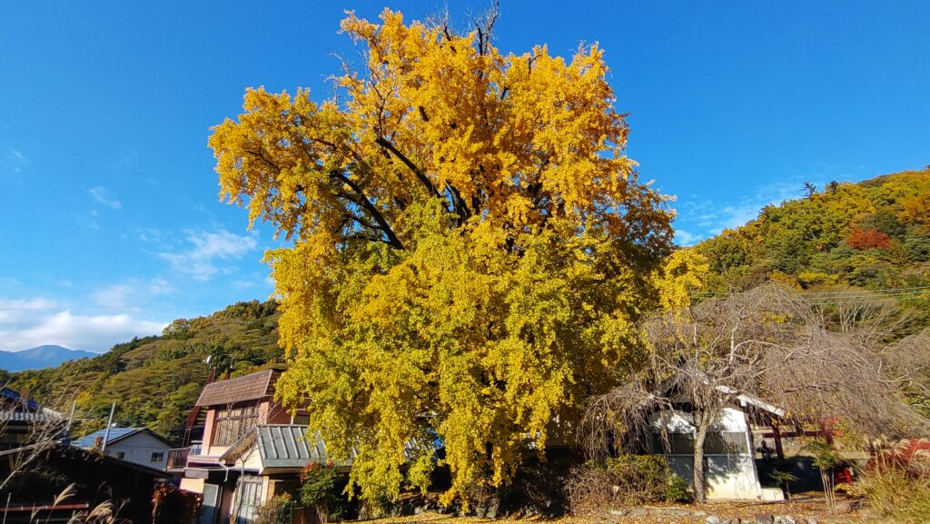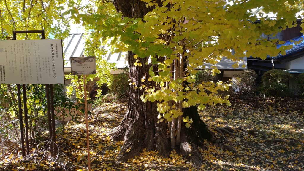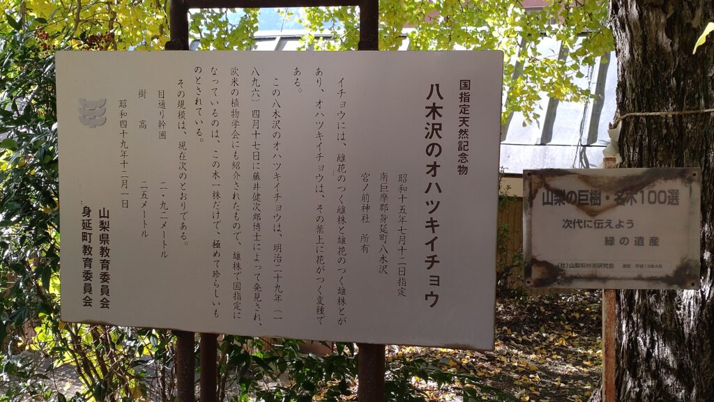 国の天然記念物に指定された7本のオハツキイチョウの中で[† 1]、唯一の雄木(雄株)である[3][4][5] が、2011年(平成23年)の秋、雄株にもかかわらずギンナンの実をつけたことから植物学者らによる調査が行われ、その結果、一つの枝が性転換していることが確認された[6]。山梨の巨樹・名木100選のひとつ[3]。】