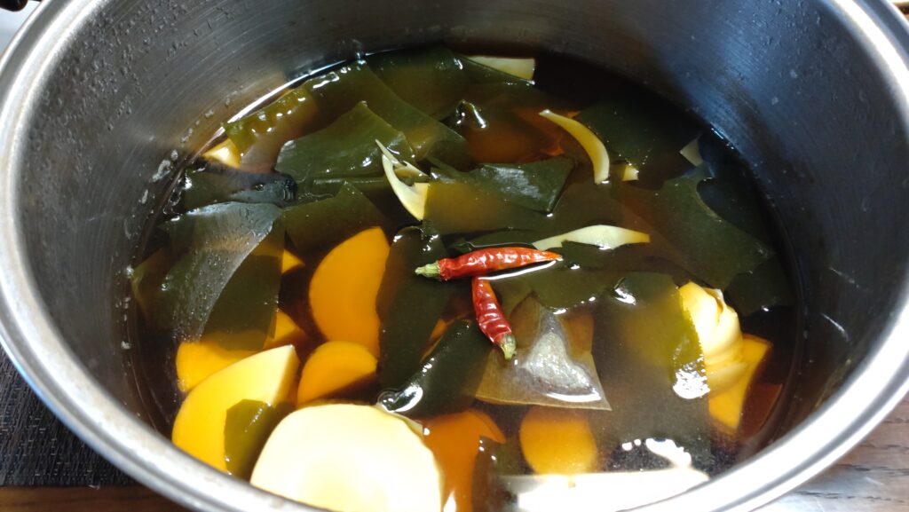 慌てて茹でて ワカメと一緒に煮てみました。
