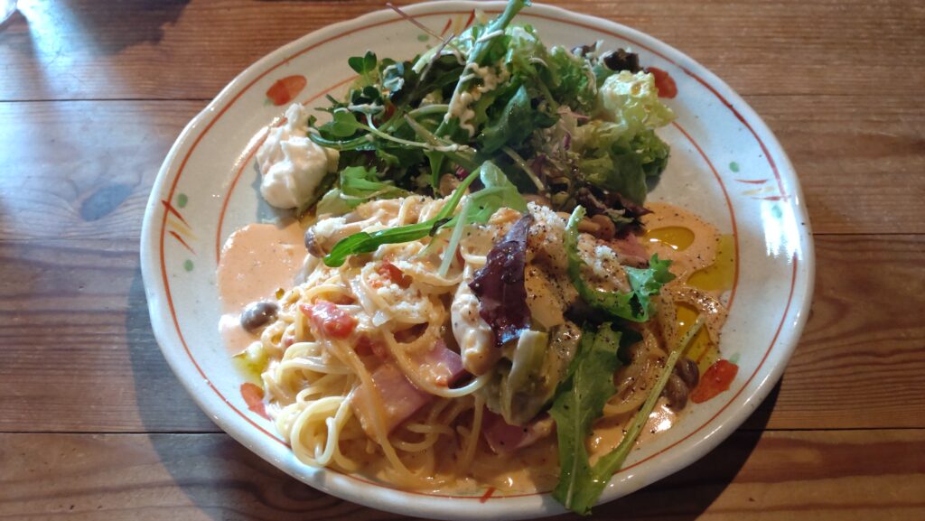 パスタとサラダがワンプレートになっていて。