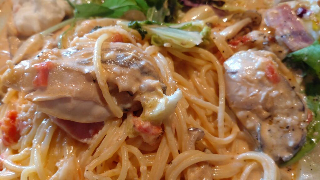 中でも 大粒カキのホワイトクリームパスタ を注文。