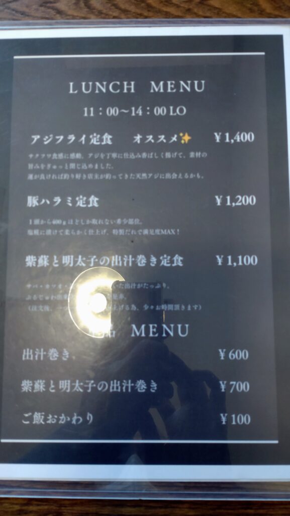 メニューは多くなくて 鯵フライ定食と豚ハラミ定食 そして 出汁巻たまご定食 と 単品の出汁巻きたまご これだけ。