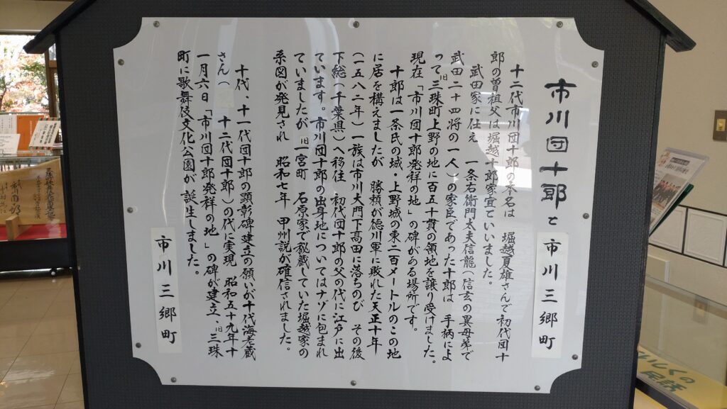 で 前置きが長くなったけど 歌舞伎の市川家(市川團十郎)の 初代の曾祖父、堀越十郎家宜が この市川出身なんだそうです。