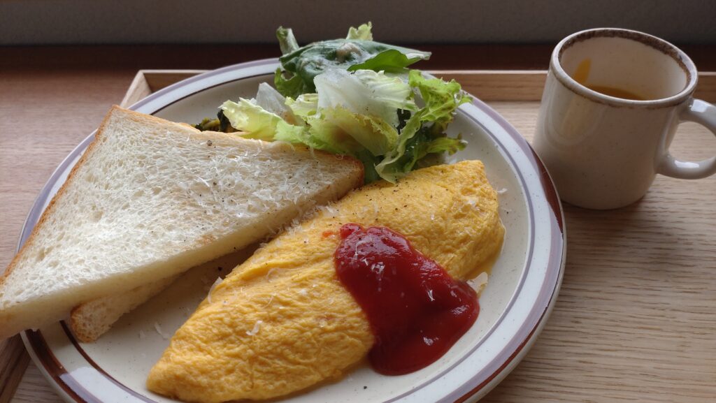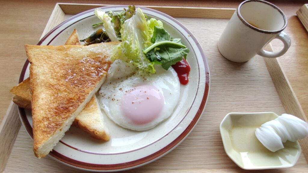で 僕が頼んだのが モーニングセットの目玉焼き 連れが オムレツ。