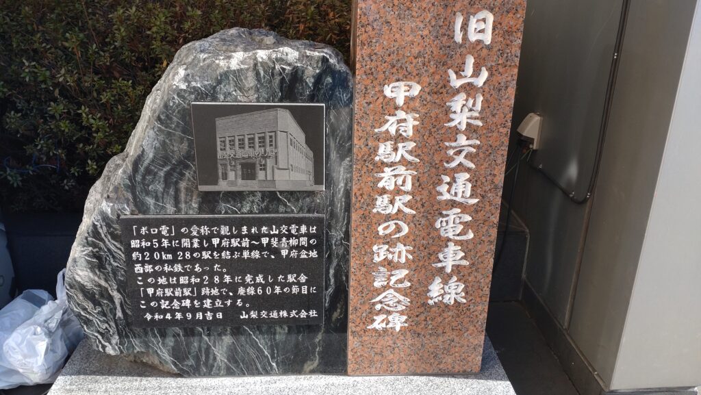 甲府駅の南口の階段を降りて左側のビルに 『甲府駅前駅の跡 記念碑』という碑が立っています。